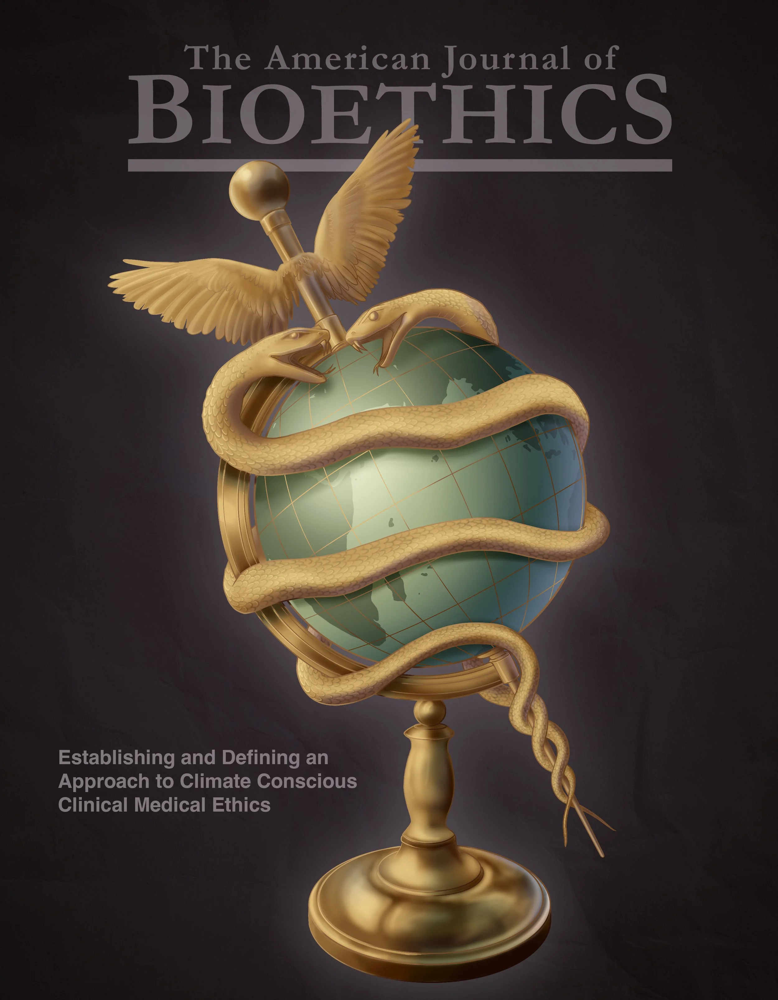 This journal cover was designed to provoke interest in the subject of bioethics as it relates clinical practice to global climate responsibility. It utilizes the Caduceus–often confused for the Rod of Asclepius–drawing on its use as a medical symbol and a symbol of peace and diplomacy.